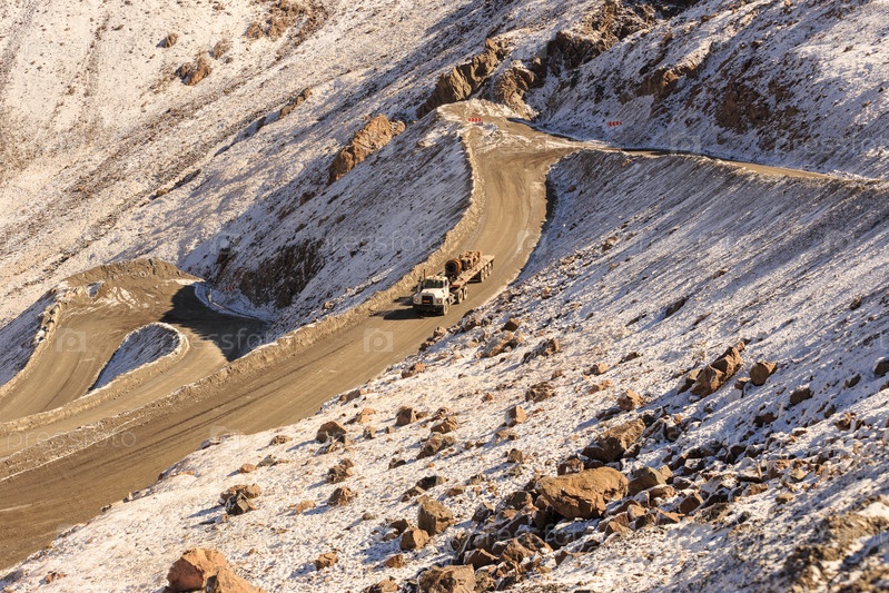 Грузовик с грузом по горной дороге, ведущей к золотому руднику Кумтор, ущелье Барскоон, Иссык-Кульская область, Кыргызстан