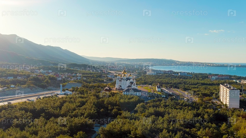 Геленджик, Россия. Собор Андрея Первозванного. Текст при въезде в город переводится как Геленжик-городской курорт, вид с воздуха