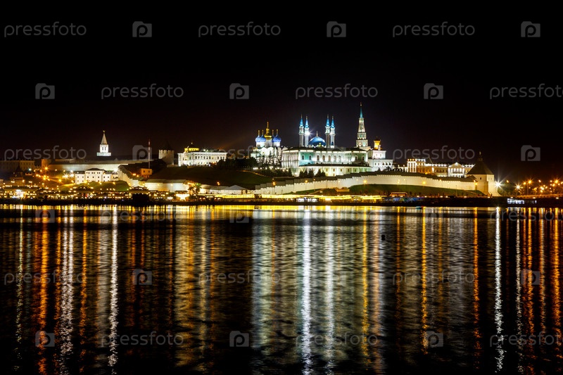 Казанский Кремль. Ночной вид с реки с отражением. Казань, Россия