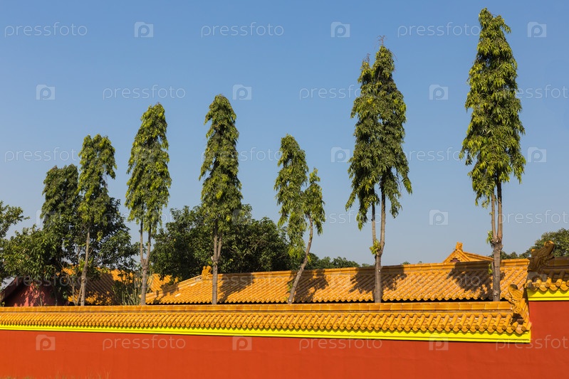 Зеленые деревья за стеной храма, Лумбини, Непал