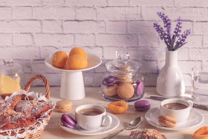 Завтрак с различными миндальными печеньями, круассанами и горячим шоколадом