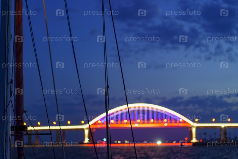 Расплывчатый светящийся силуэт Крымского моста за мачтами яхты