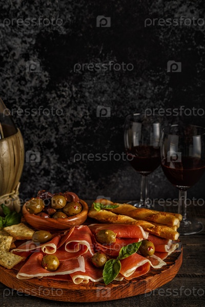 Прошутто, крекер, хлебные палочки с красным вином