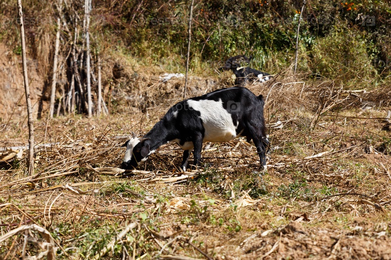 Коза ест траву в поле, Гималаи, Непал