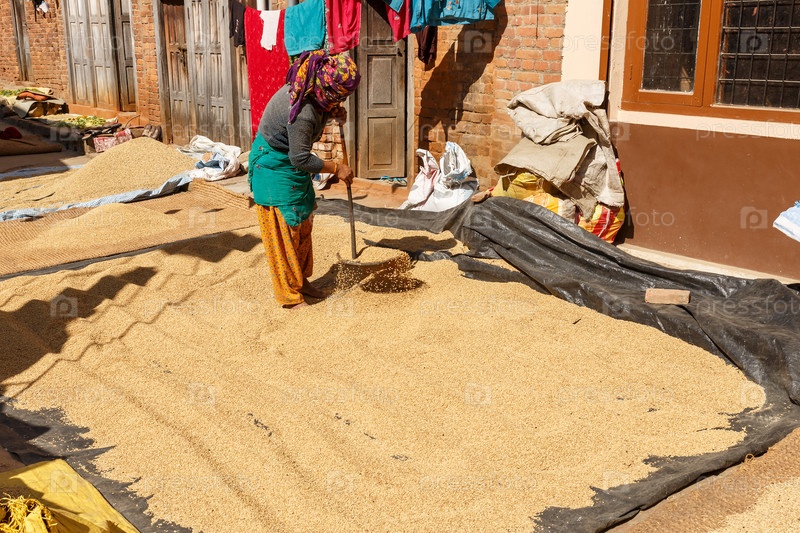 Непальская женщина переворачивает сырой рис, высушенный на земле, Киртипур, Непал