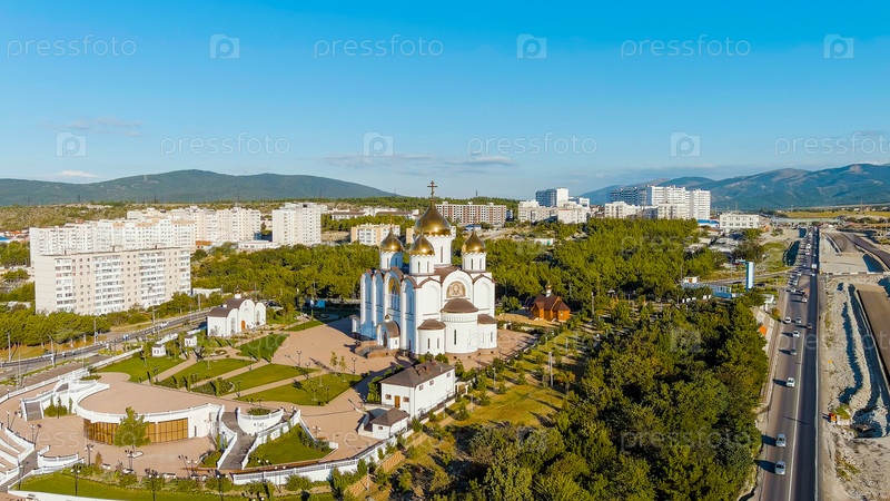 Геленджик, Россия. Собор Андрея Первозванного. Переведен текст вдоль трассы М4-Дон: Слава России, Кубань-Жемчужина России, Вид с воздуха