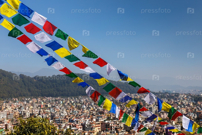 Буддийские молитвенные флаги на фоне долины Катманду, Непал