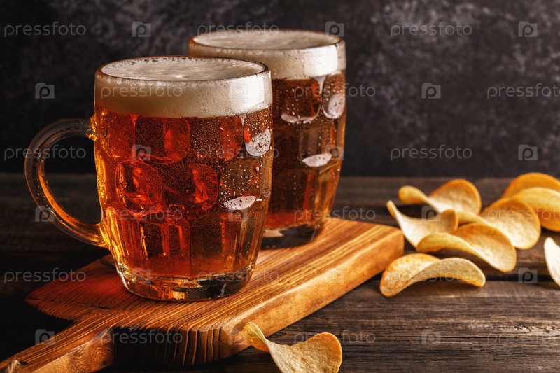 Холодное пиво в стакане с чипсами на темном фоне