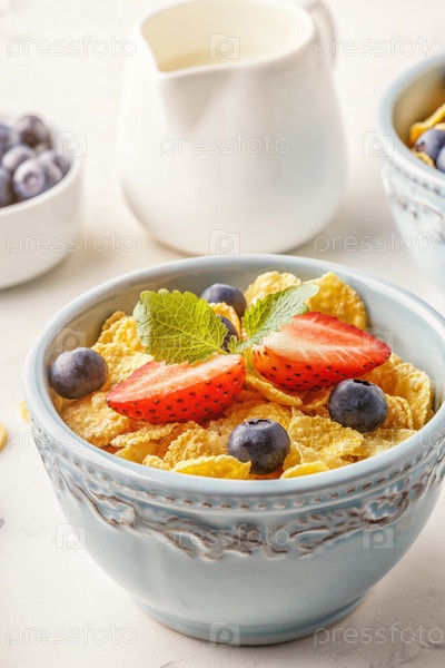 Здоровый завтрак - кукурузные хлопья с фруктами и ягодами