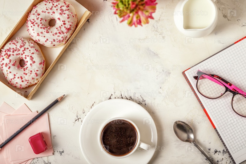 Блокнот, пончики и кофе на белом столе