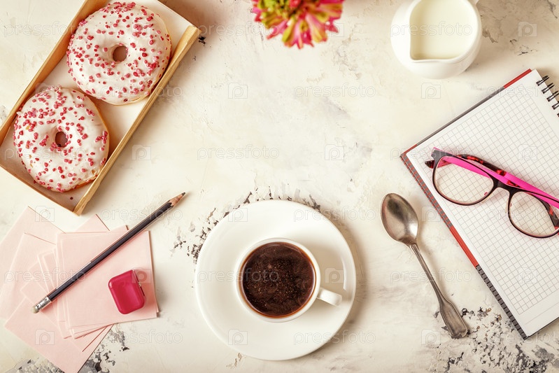 Блокнот, пончики и кофе на белом столе