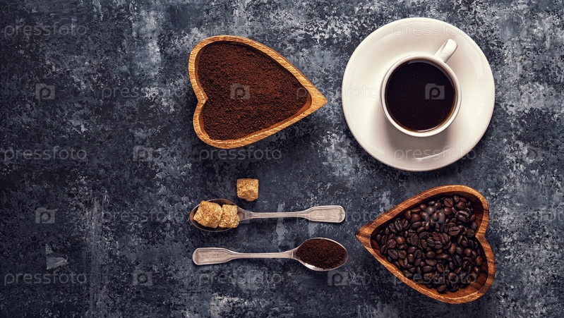 Кофейная чашка, бобы и молотый порошок на каменном фоне