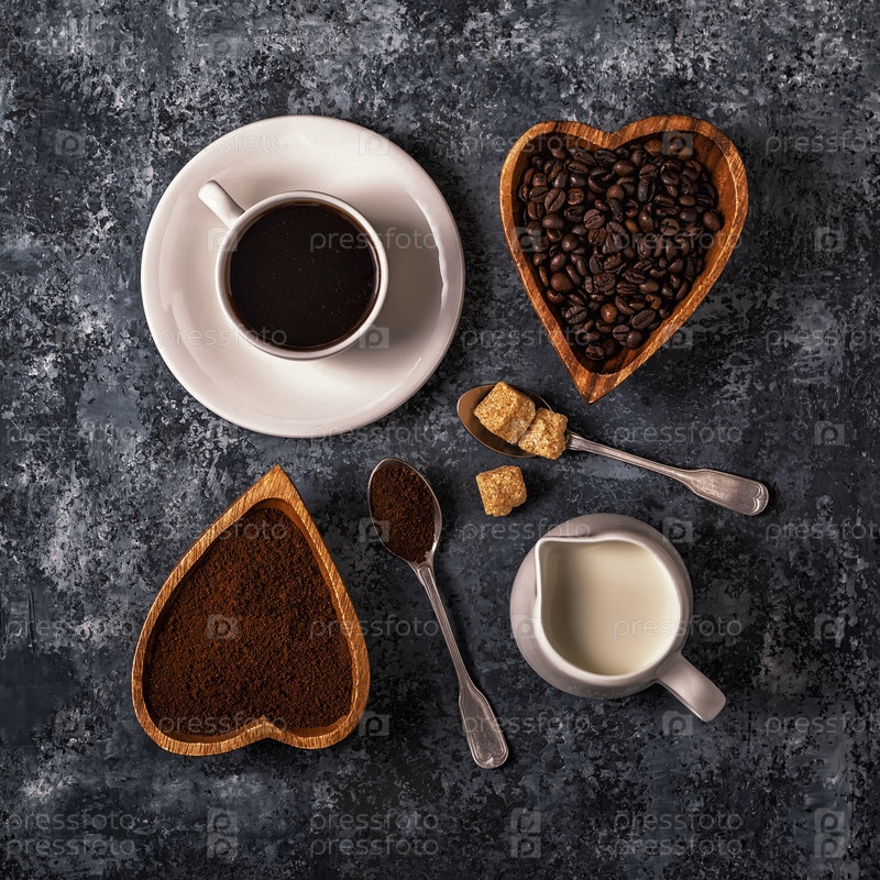 Кофейная чашка, бобы и молотый порошок на каменном фоне