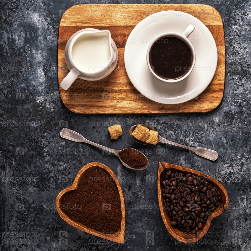Кофейная чашка, бобы и молотый порошок на каменном фоне