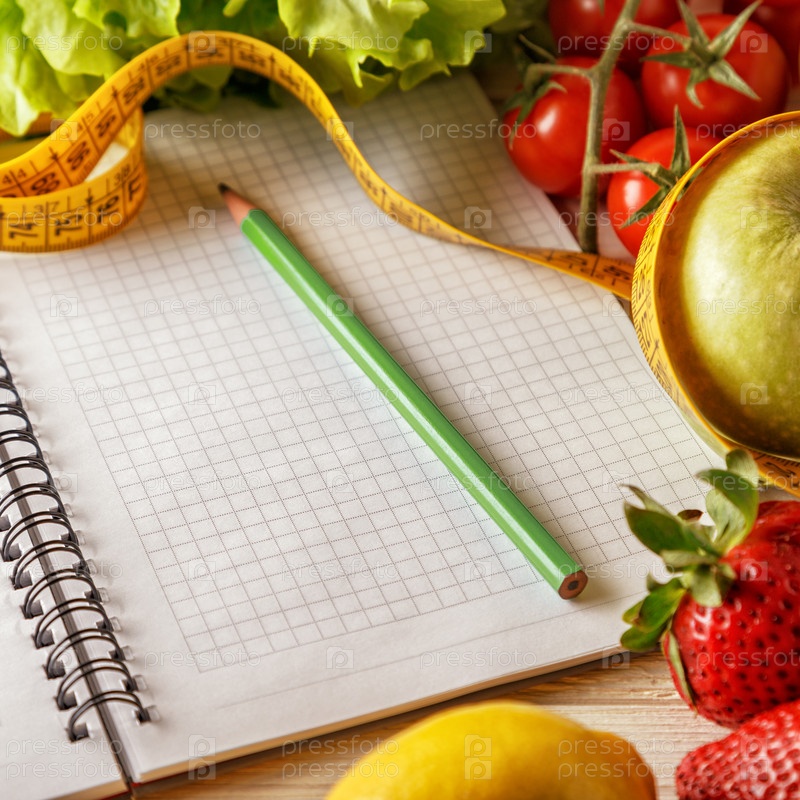 Свежие органические овощи и фрукты, открытый пустой блокнот и ручка на деревянном фоне