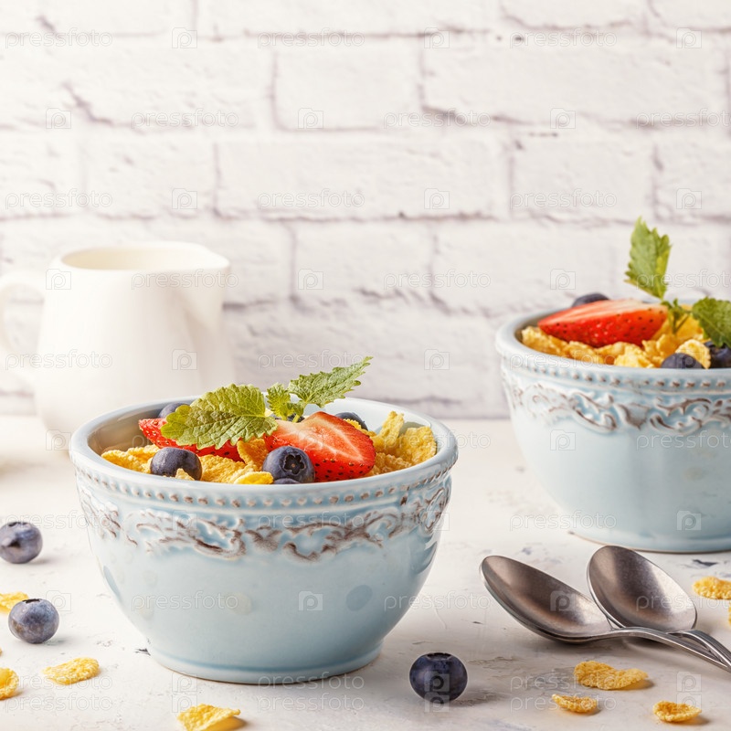 Здоровый завтрак - кукурузные хлопья с фруктами и ягодами