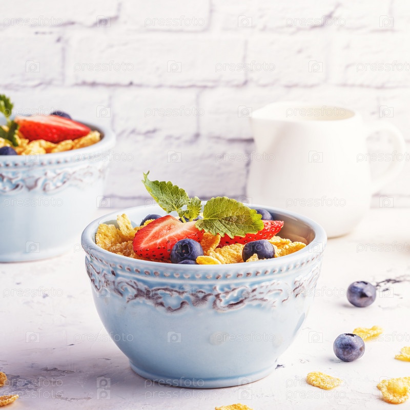 Здоровый завтрак - кукурузные хлопья с фруктами и ягодами