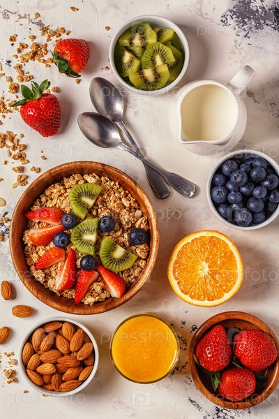 Здоровый завтрак - чаша мюсли, ягод и фруктов