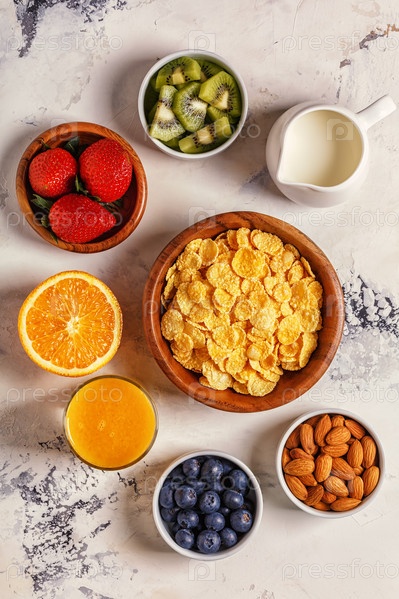 Здоровый завтрак - миска кукурузных хлопьев, ягод и фруктов