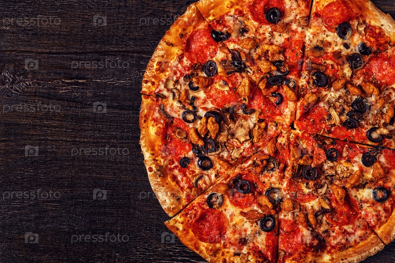 Пицца с сыром моцарелла, пепперони, фаршем, грибами