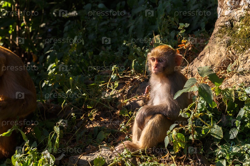 Обезьяна сидит возле дерева, храм Сваямбунатх, Катманду, Непал