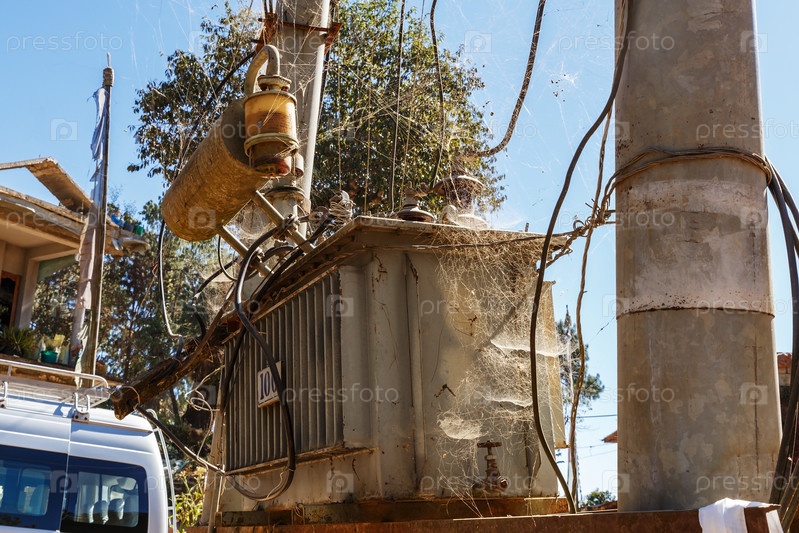 Электрический трансформатор на посту в Непале. Трансформер запутался в паутине