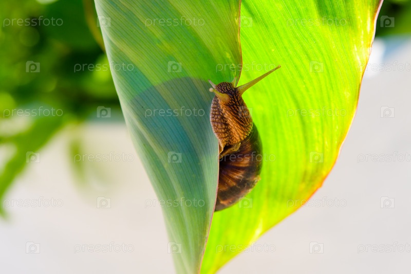 Большая улитка висит на большом зеленом листе растения. Селективный фокус на голове