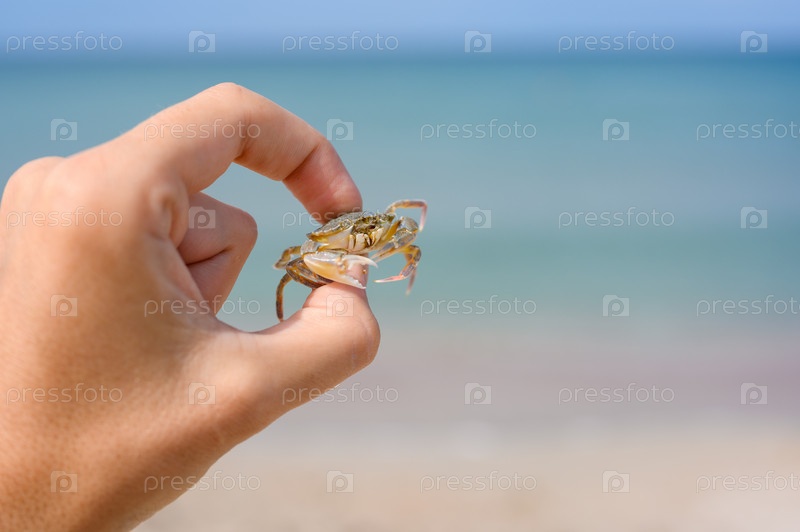 Маленький светлый краб в мужской руке на фоне моря. Животный мир Крыма. Селективный фокус на крабе