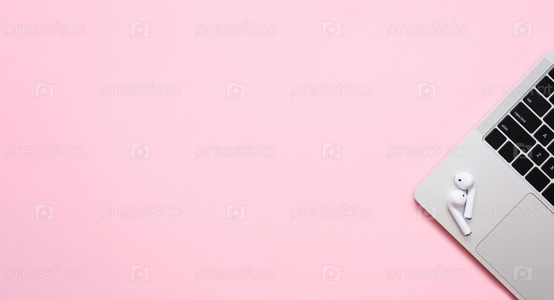 Беспроводные наушники на ноутбуке на розовом фоне. Плоская планировка, пространство для копирования