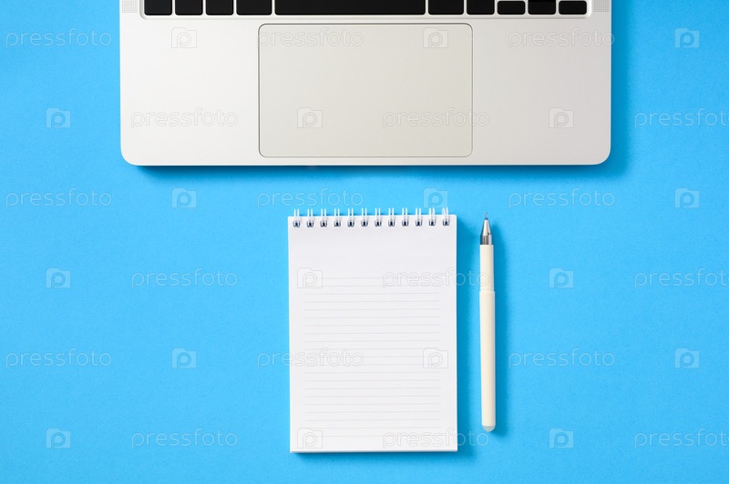 Серебристый ноутбук и блокнот с чистым белым листом на синем фоне. Плоская планировка, пространство для копирования