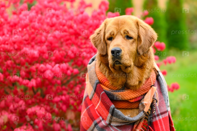 Крупным планом портрет красивой собаки в одеяле на фоне красной осенней листвы. Осеннее настроение