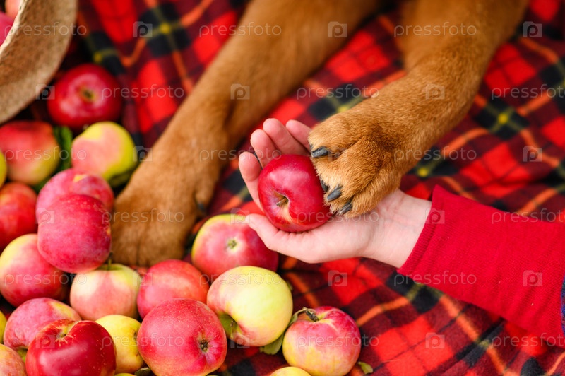Большая лапа собаки на спелом красном яблоке. Сбор яблок. Выборочное фокусирование на лапе