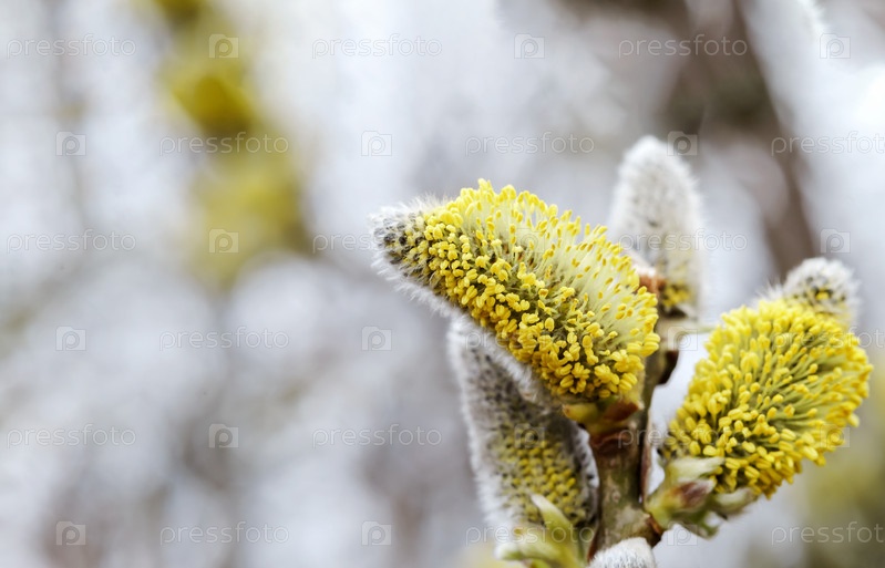 Верба пушистая. Деревья цветут весной. Бутоны на дереве