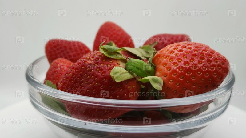 Свежая спелая клубника в прозрачной глубокой миске. Вкусная сладкая красная ягода. Питание для вегана и вегетарианца. Натуральный растительный десерт. Садовая земляника в стеклянной тарелке. Сезон сбора урожая. Крупный план. Полезная еда и правильное здор