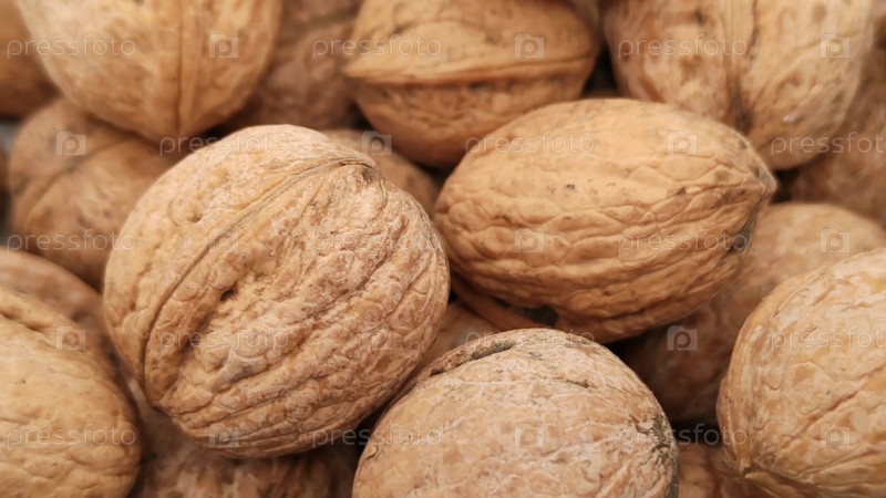 Много грецких орехов. Крупные орехи в скорлупе. Сбор урожая фруктов. Текстура скорлупы грецких орехов. Правильное питание и здоровая еда для вегана и вегетарианца. Крупный план