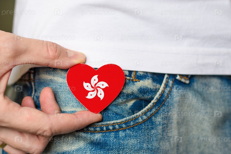 Житель Гонконга. Деревянный значок с флагом Гонконга в форме сердца в мужской руке