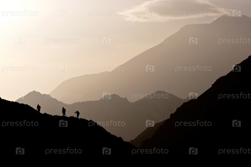 Крохотные фигурки людей на горном хребте, Кавказ, Эльбрус