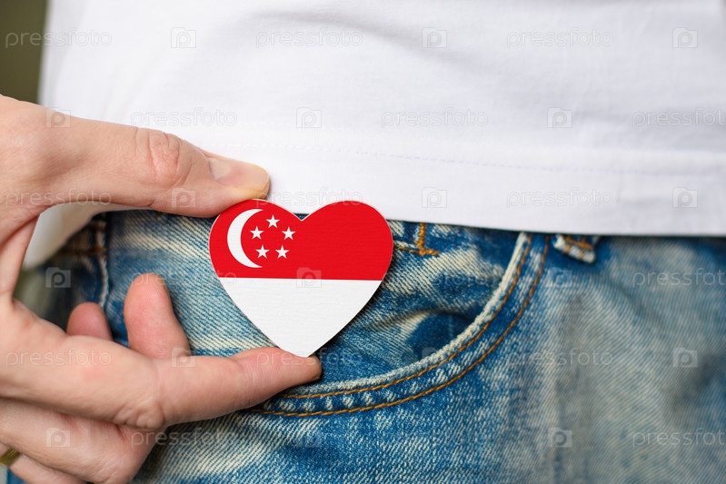 Патриот Сингапура. Деревянный значок с флагом Сингапура в форме сердца в мужской руке