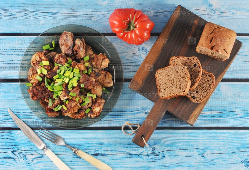 Жареная печень с луком на тарелке, помидорами и ржаным хлебом