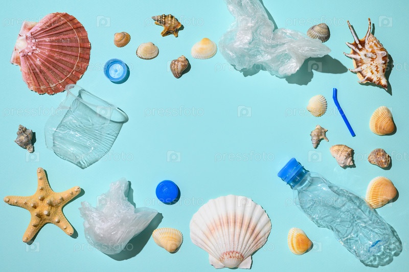 Много разных ракушек и пластикового мусора на синем фоне. В центре есть пустое место. Концепция загрязнения морей и океанов пластиком