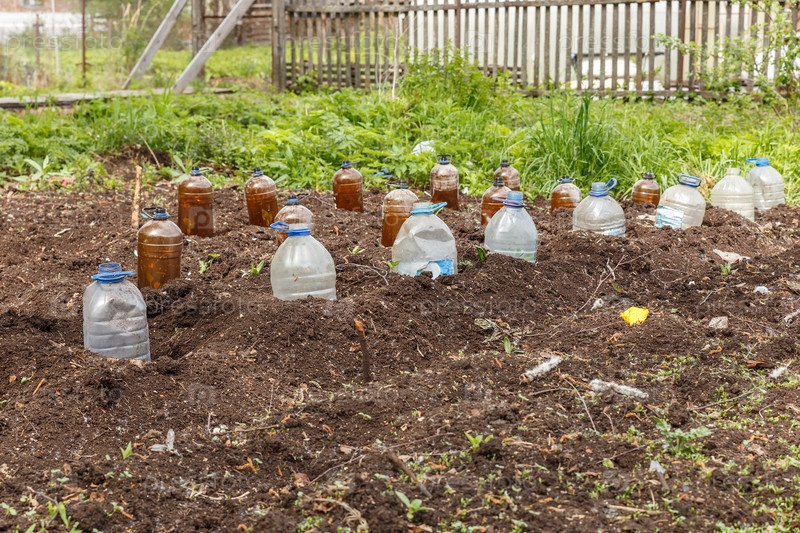Рассада овощных растений, покрытая пластиковой бутылкой в саду, теплице