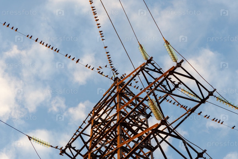 Большая группа птиц сидит на проводах линии электропередач
