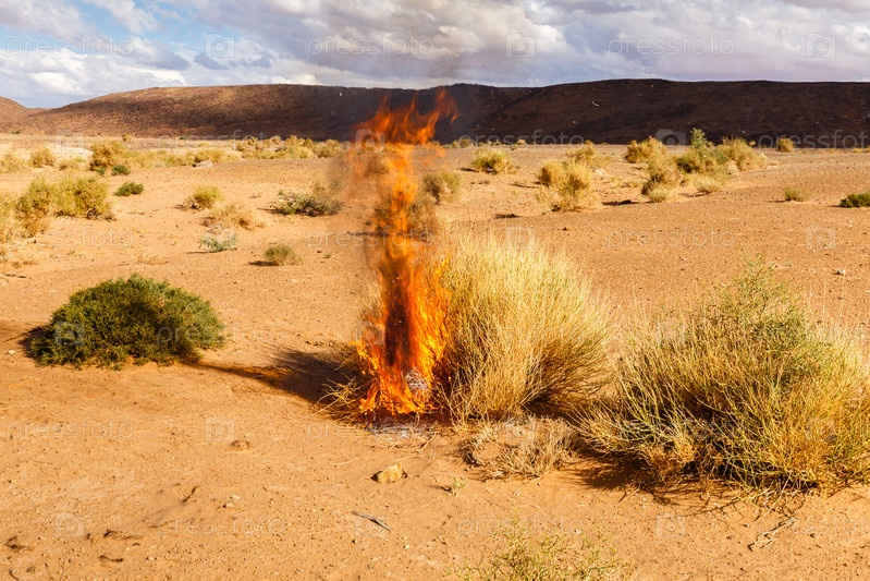 Куст сжигает сухую траву, пустыня Сахара, Сухой горящий куст