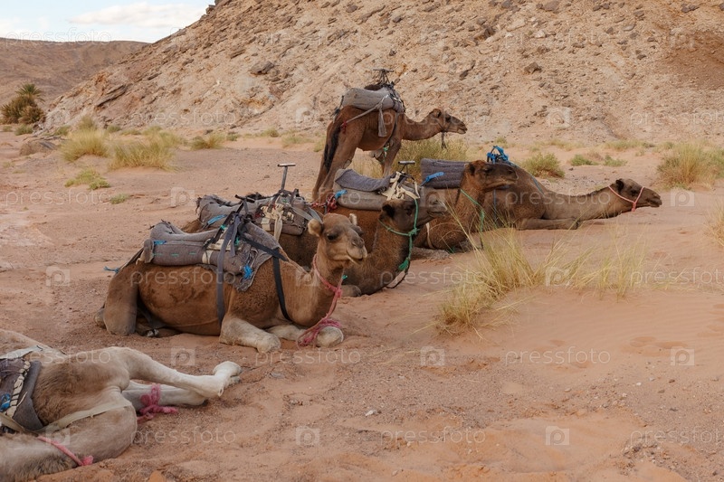Верблюды отдыхают на песке в пустыне Сахара. Марокко