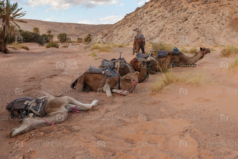 Верблюды отдыхают на песке в пустыне Сахара. Марокко