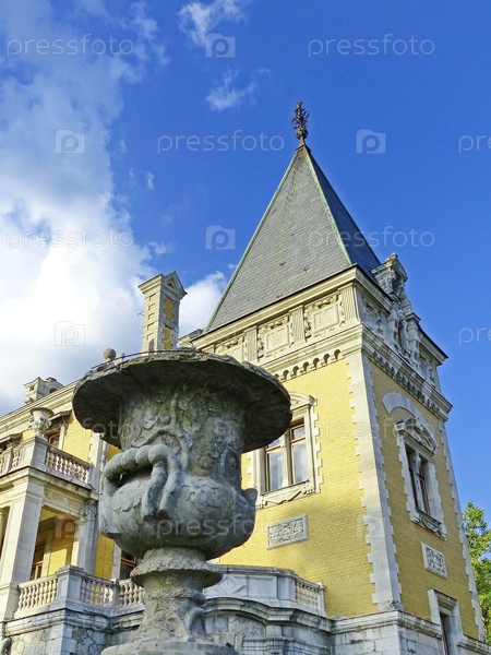 Массандровский дворец Александра III. В отделке дворца много средневековых деталей, прослеживаются архитектурные черты раннего барочного стиля Людовика XIII. Южное побережье Крыма, Верхняя Массандра, Россия, сентябрь 2019 г