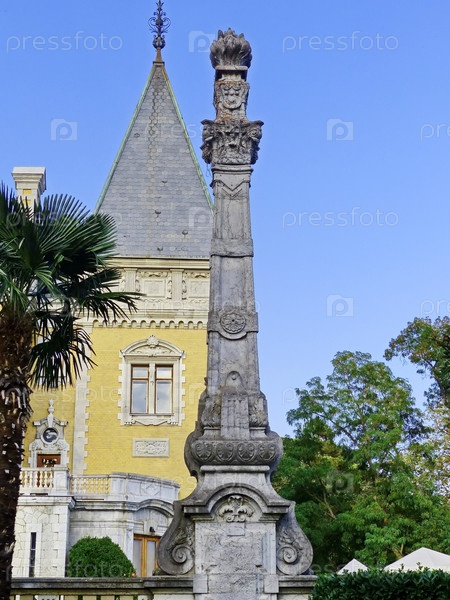 Массандровский дворец Александра III. В отделке дворца много средневековых деталей, прослеживаются архитектурные черты раннего барочного стиля Людовика XIII. Южное побережье Крыма, Верхняя Массандра, Россия, сентябрь 2019 г