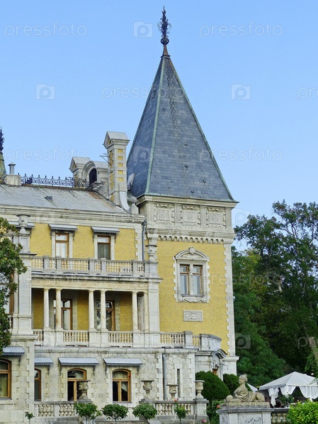 Массандровский дворец Александра III. В отделке дворца много средневековых деталей, прослеживаются архитектурные черты раннего барочного стиля Людовика XIII. Южное побережье Крыма, Верхняя Массандра, Россия, сентябрь 2019 г