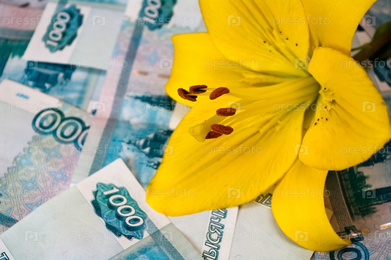Желтая лилия лежит на разбросанных купюрах