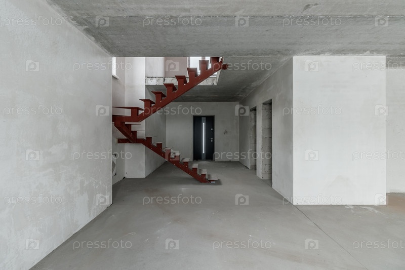 Ремонт в здании. Здание с металлической лестницей во время ремонта. Строительная площадка в доме без людей. Строительство нового дома. Строительство и архитектура